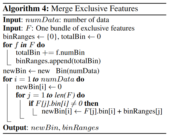 - 按顺序对排好序的特征进行遍历,对于当前特征i,查看是否能加入已有的bundle(冲突要小),若不行,则新建一个bundle